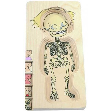 Puzzle en bois à 4 niveaux: au fond du puzzle dessin du squelette, sur lequel viennent s'encastrer 4 puzzles: organes, muscles, nu et habillé. Sur le coté du puzzle figurent des vignettes qui rappellent quel est le puzzle à insérer. Idéal à un âge où les enfants se posent beaucoup de questions sur leur corps.