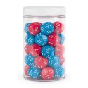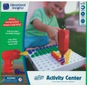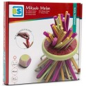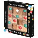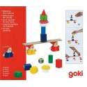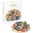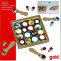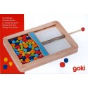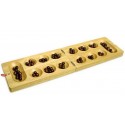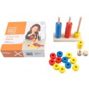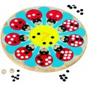 Jeu d'adresse en bois avec un disque en équilibre et des billes qu'il faut attraper avec des pinces.