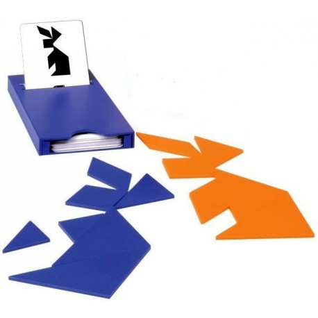 Coffret avec 2 tangrams à emporter partout, pour joueur seul ou à 2. On place une carte modèle dans le support et les 2 joueurs en même temps cherchent à reproduire le plus rapidement possible le tangram avec les 7 pièces. 14 défis se jouent seul car ils utilisent les 2 tangrams en même temps!