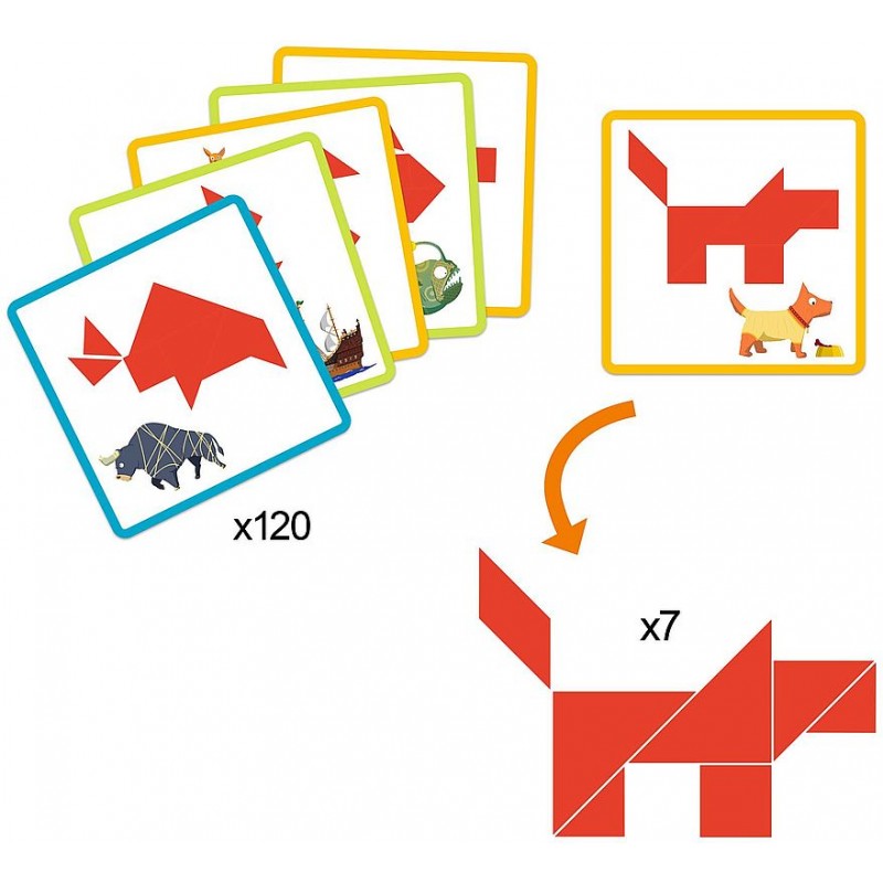 Contenu: 1 tangrams carré en bois de 7 pièces ( 12 x 12 cm) + 120 cartes défis ( 8 x 8 cm - solution au verso). Les modèles ne sont pas à l'échelle.